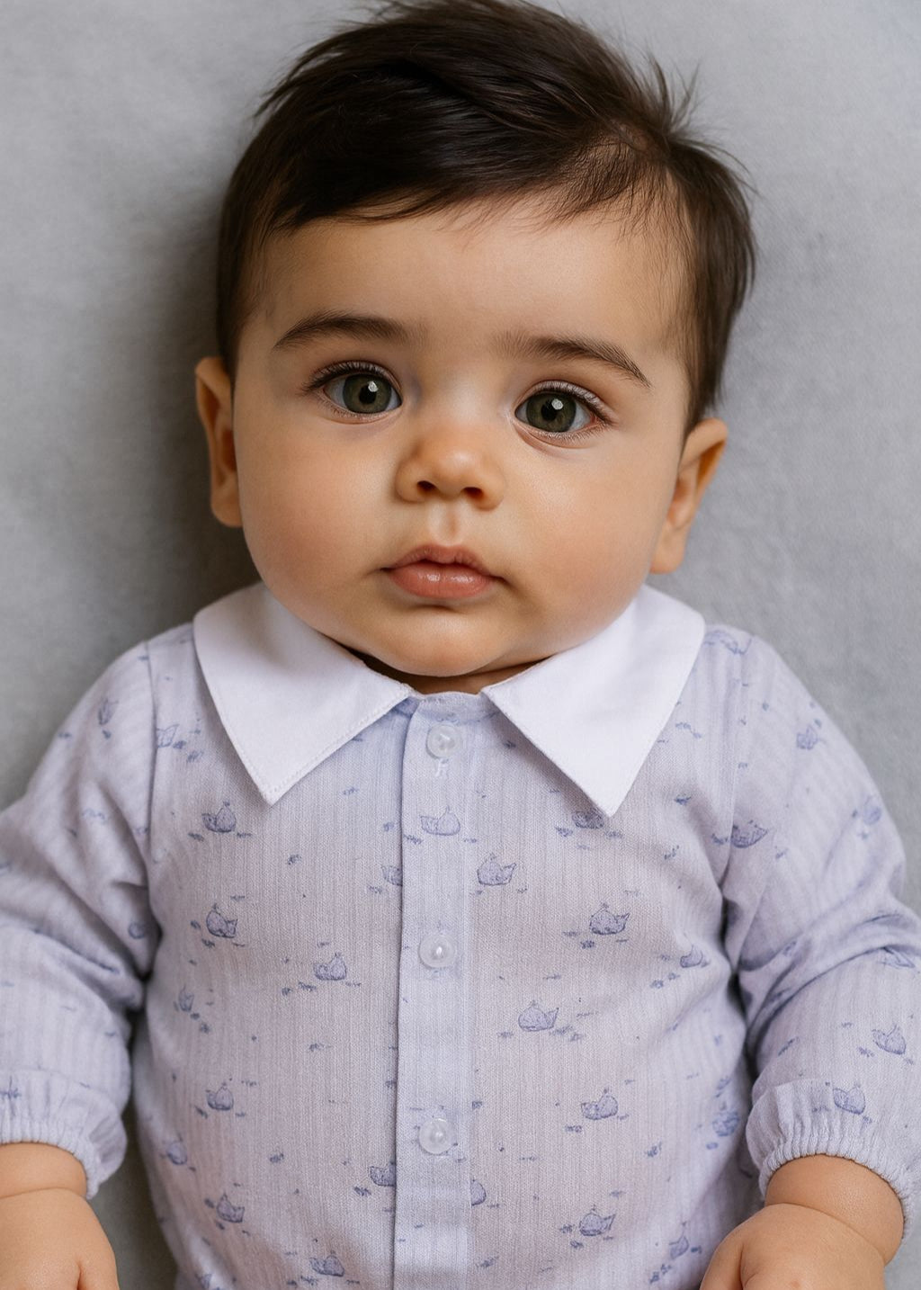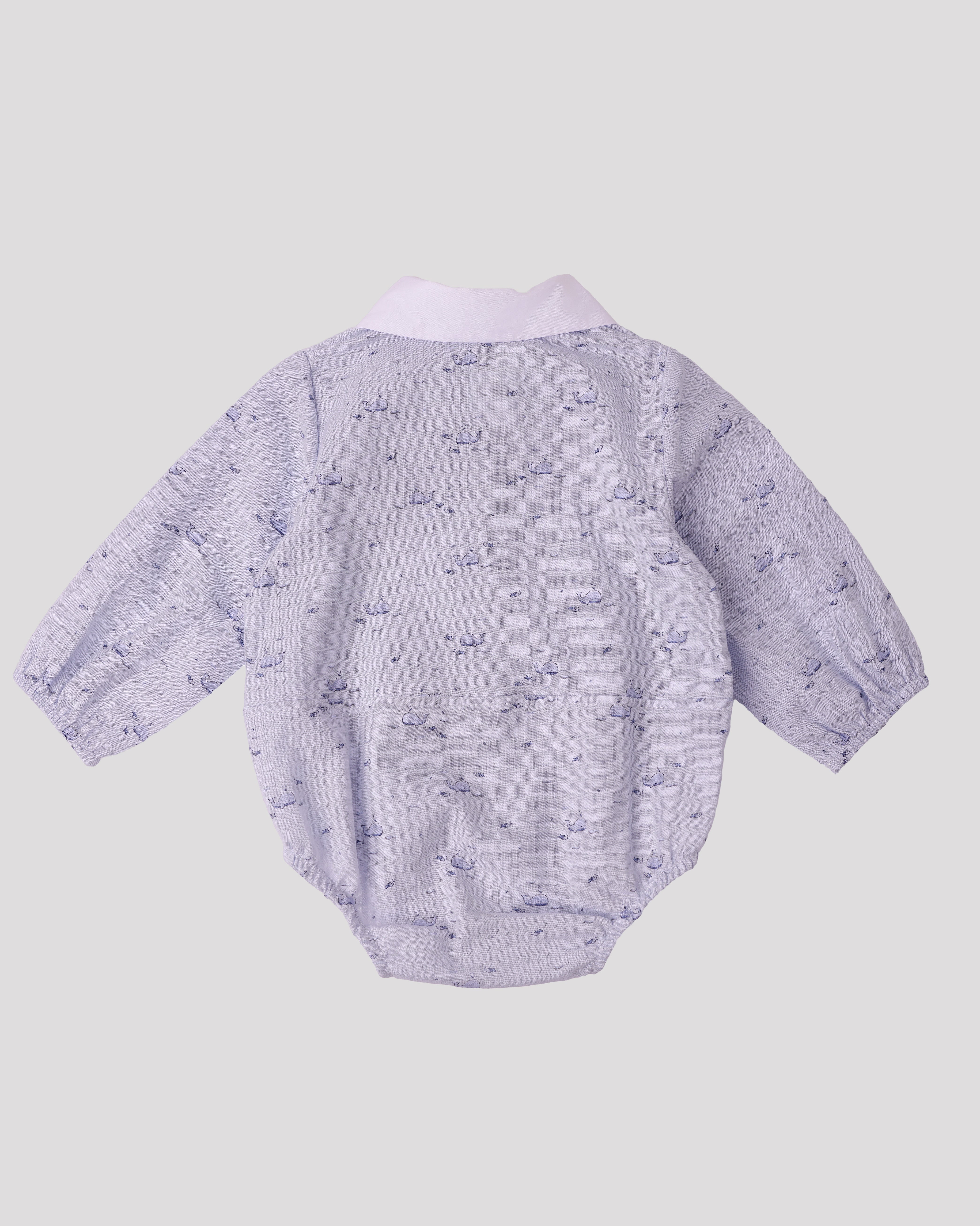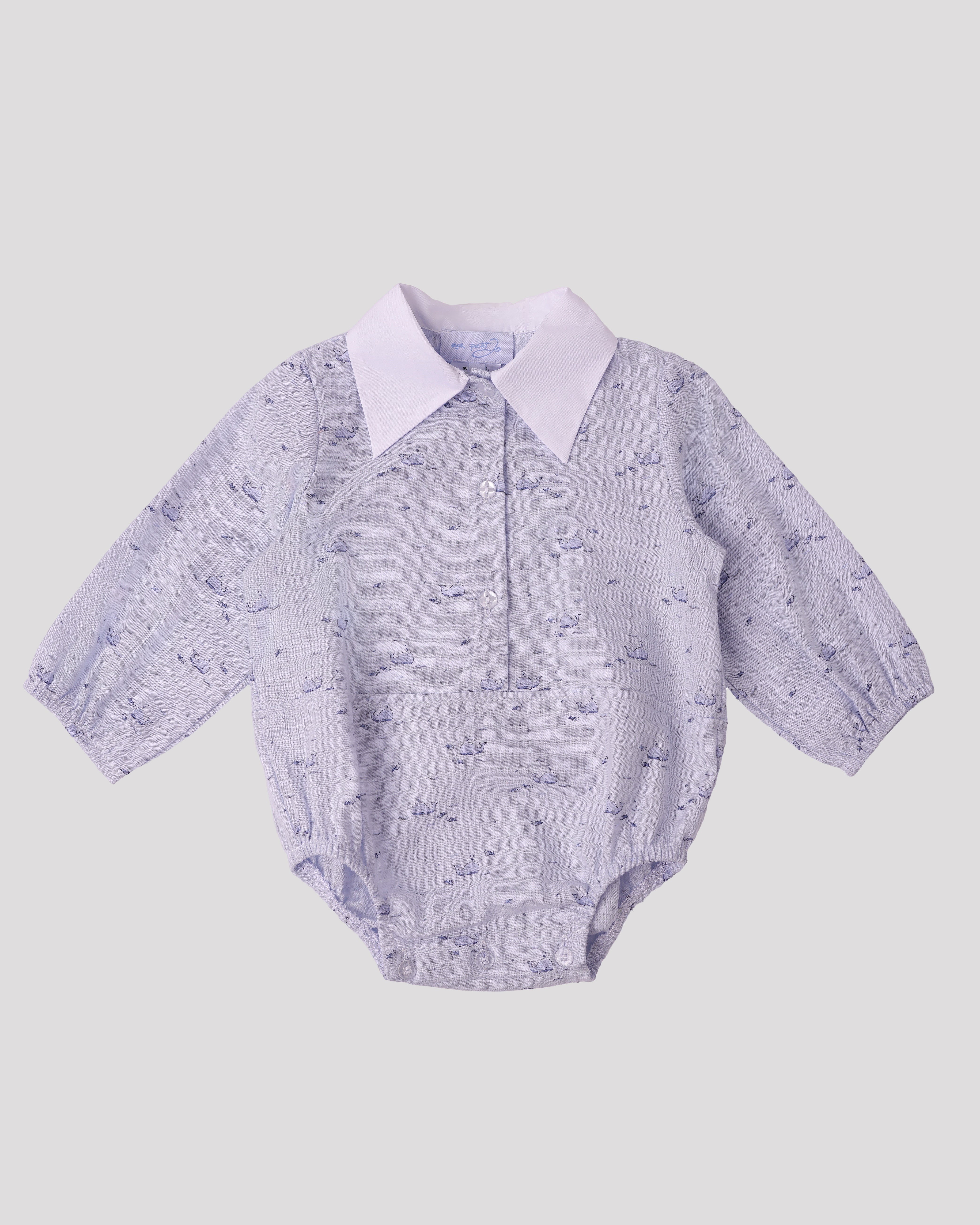 Body albastru cu balene, guler alb si maneca lunga cu terminatie elastica certificat OEKO-TEX®