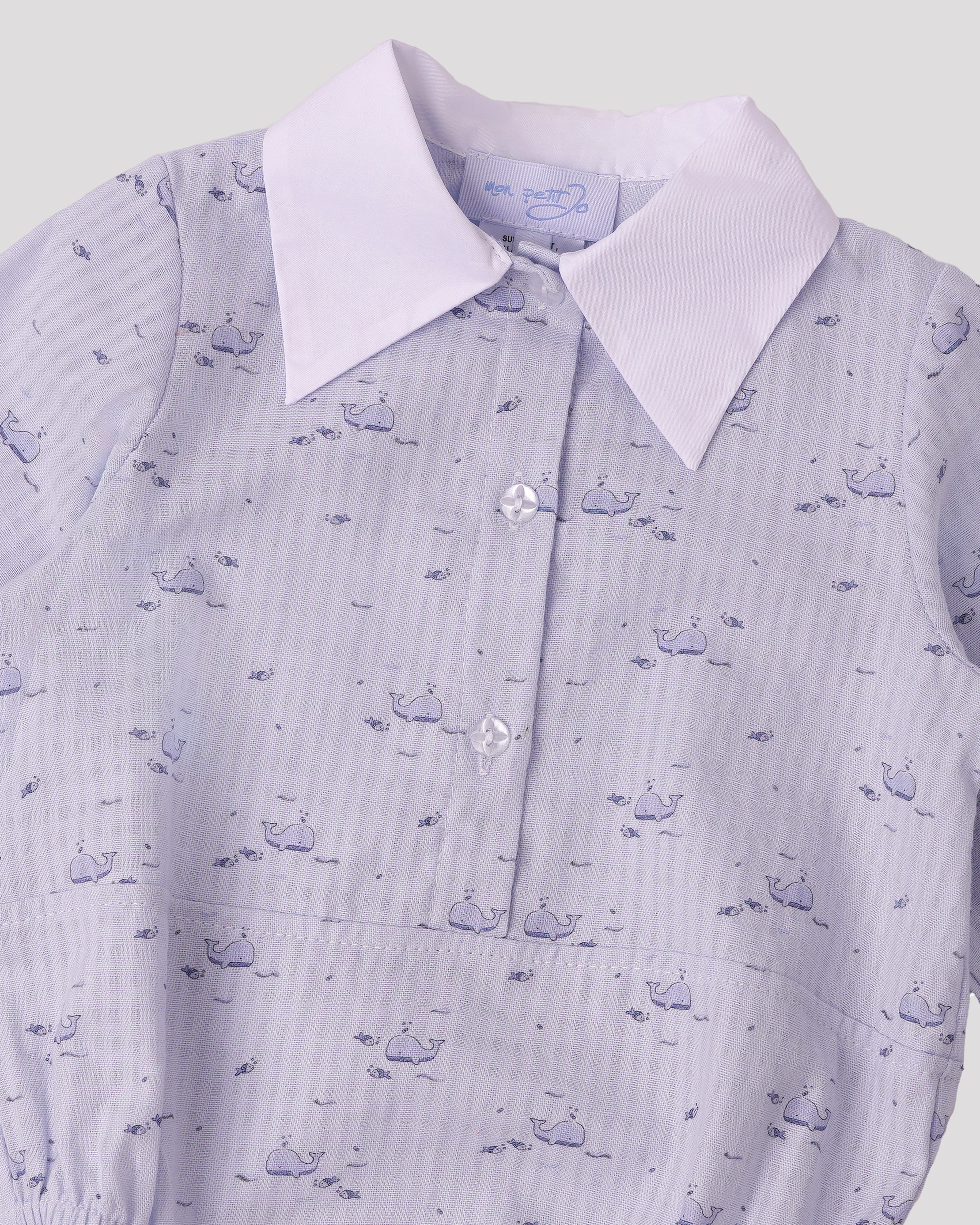 Are guler alb, bumbac albastru cu balene si nasturi frontali care adauga un aer clasic si usor sofisticat.