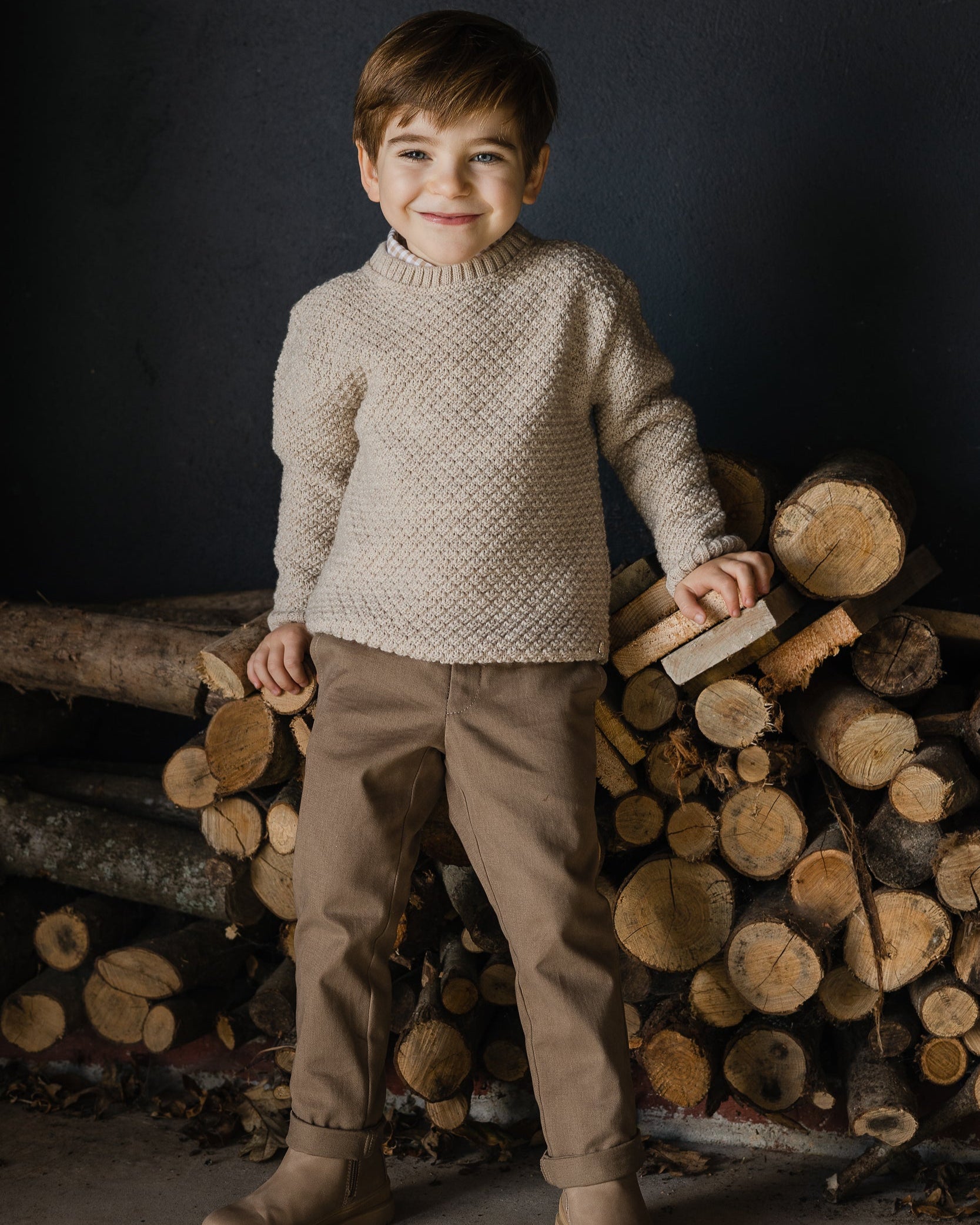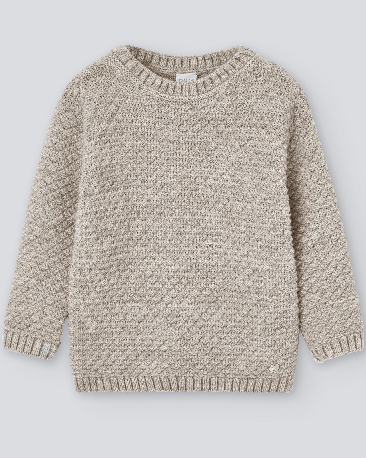 Pulover tricotat pentru copii cu panou texturat in partea din fata si margini reiate.