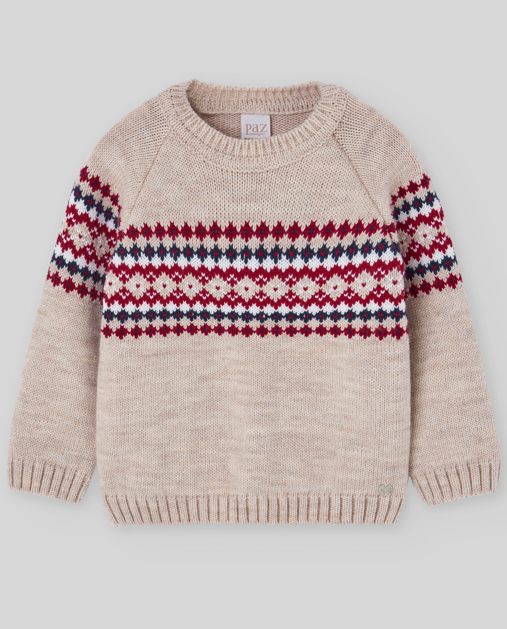 Pulover cu model jacquard in zona bustului, maneci raglan si structura groasa pentru un plus de caldura.