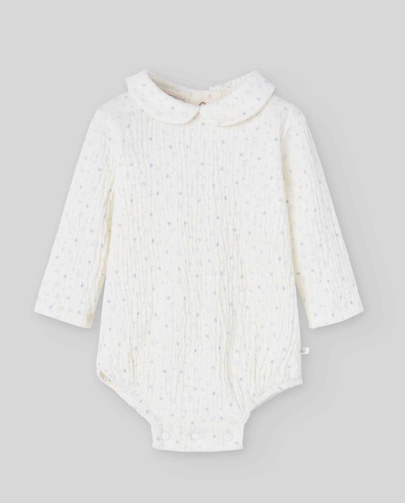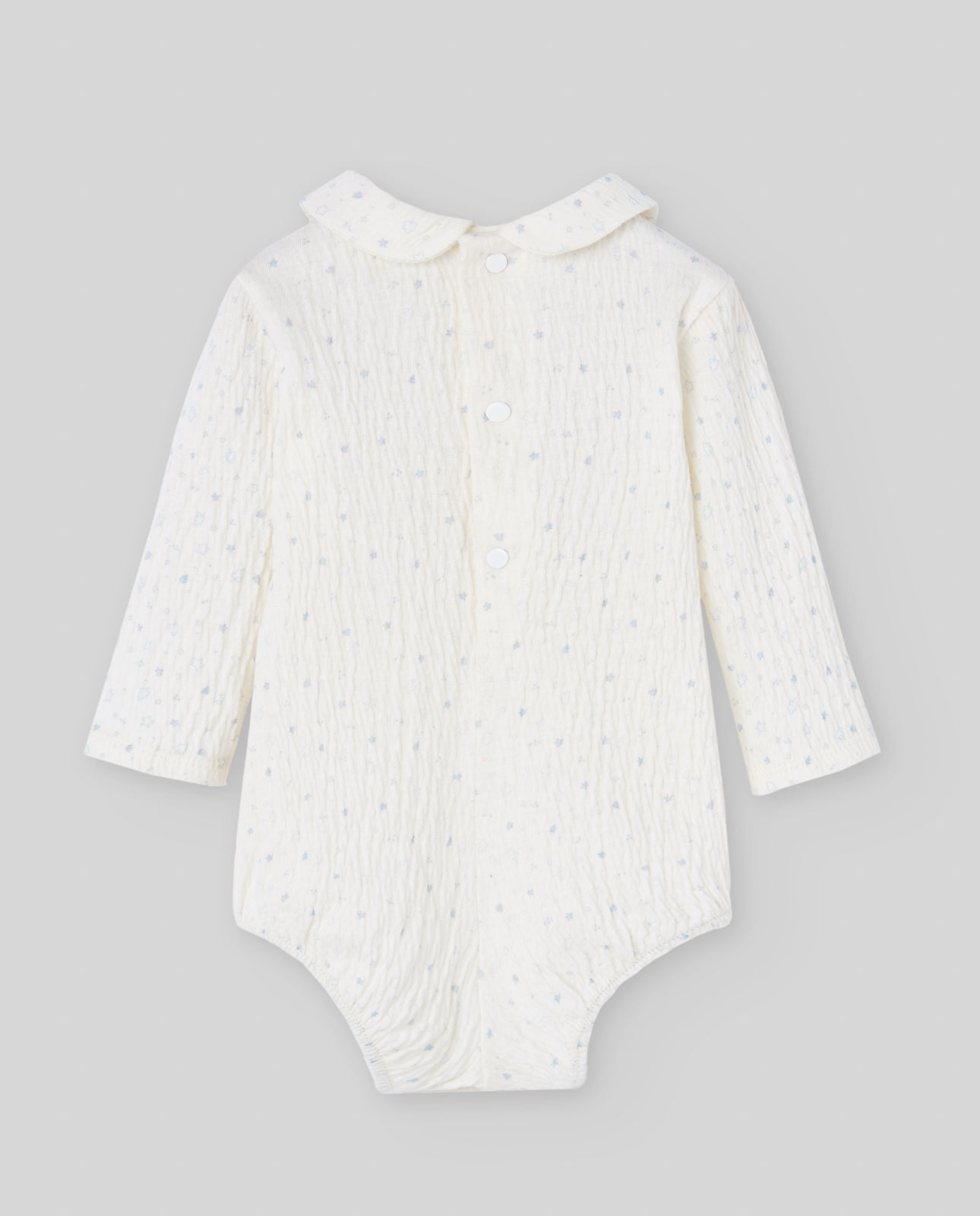 Body bebeluș din bumbac texturat, cu guler rotunjit și mâneci lungi. Model delicat ivorie cu stelute bleu, perfect pentru sezonul rece.