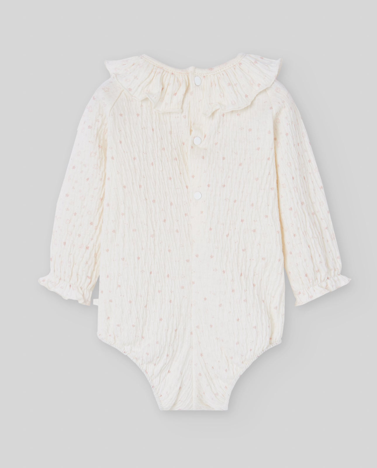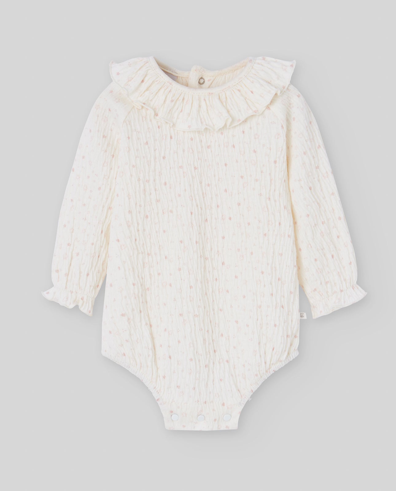Body pentru fetite din bumbac, cu imprimeu delicat de stelute roz. Prezinta guler cu volane si inchidere la spate cu nasturi. Inchiderea cu capse la nivelul scutecului asigura schimbarea rapida si usoara. O piesa rafinata si confortabila pentru tinutele de zi cu zi.