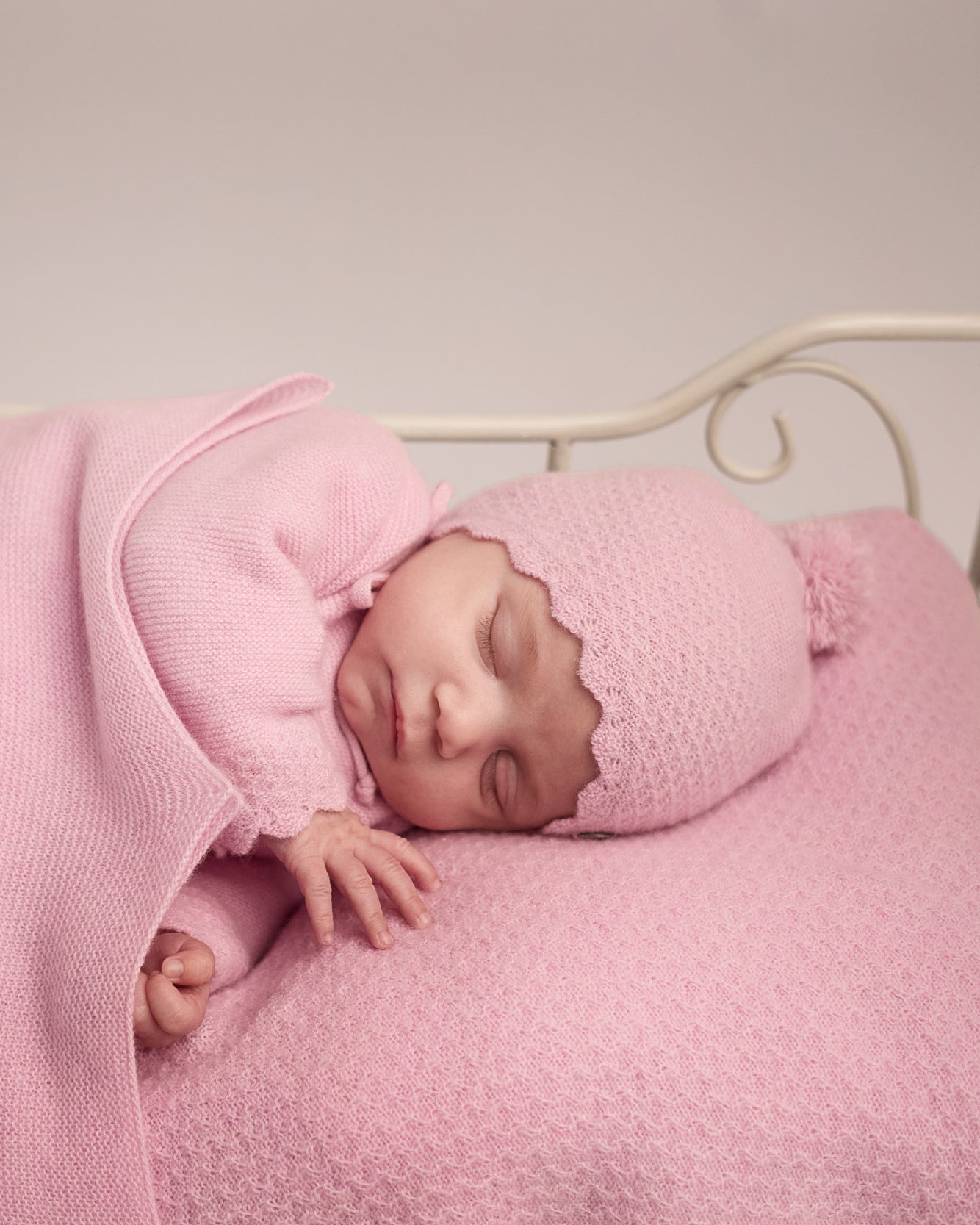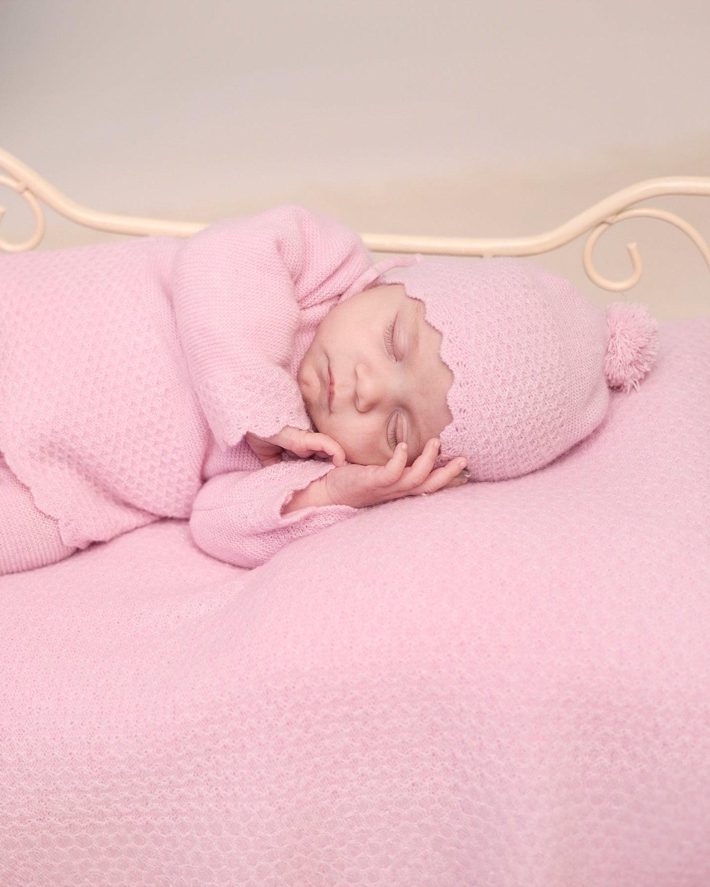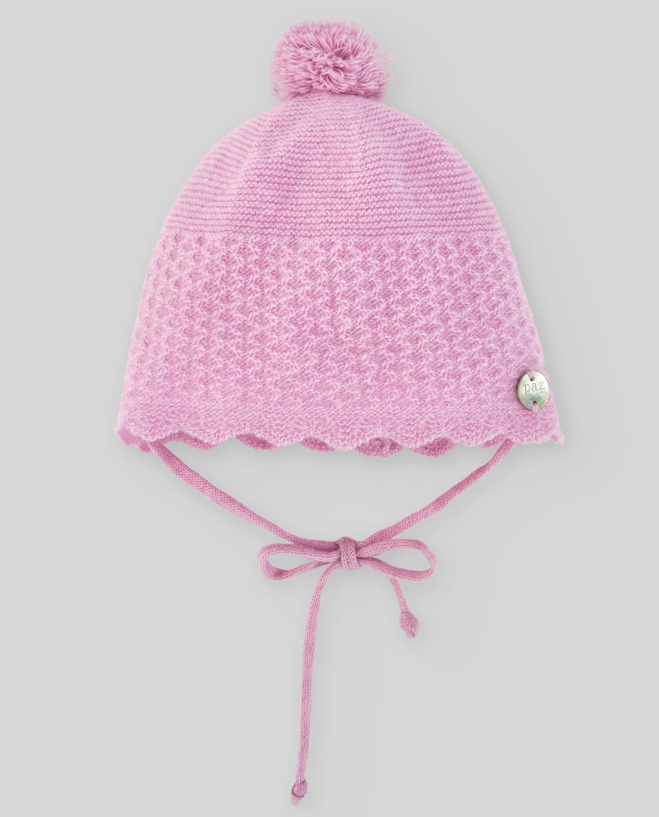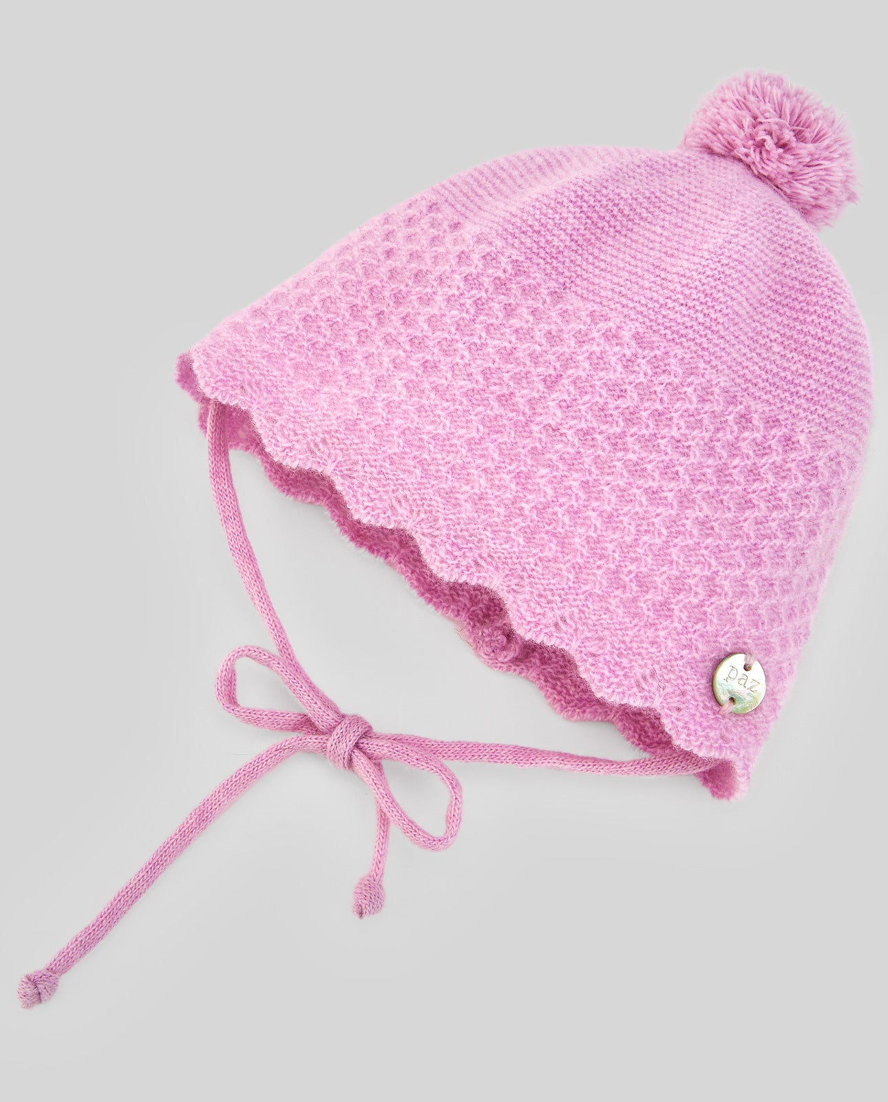 Boneta tricotata din lana si casmir, cu ciucure si textura decorativa. Se leaga sub barbie pentru o fixare mai buna si un stil delicat, potrivit pentru fetite.