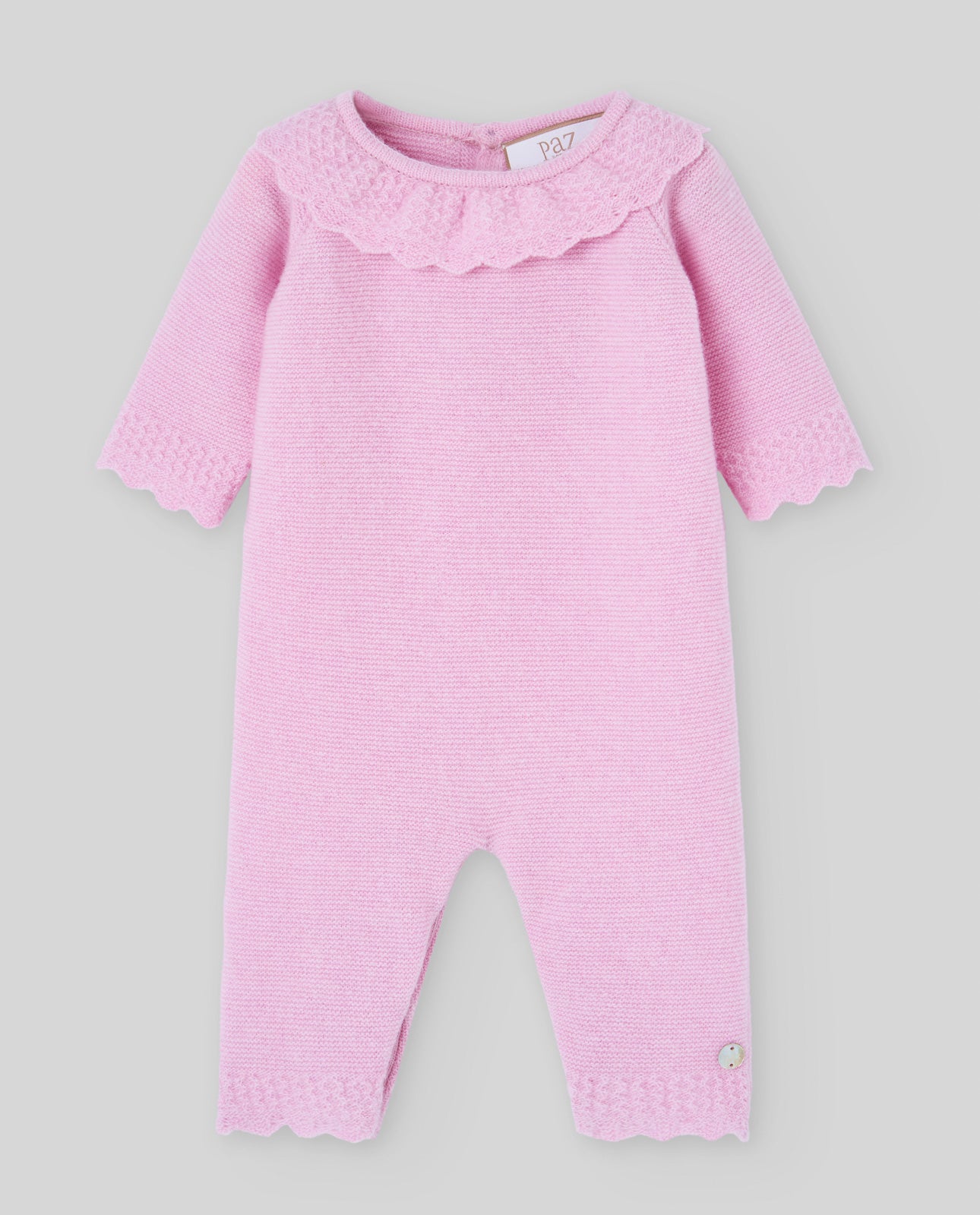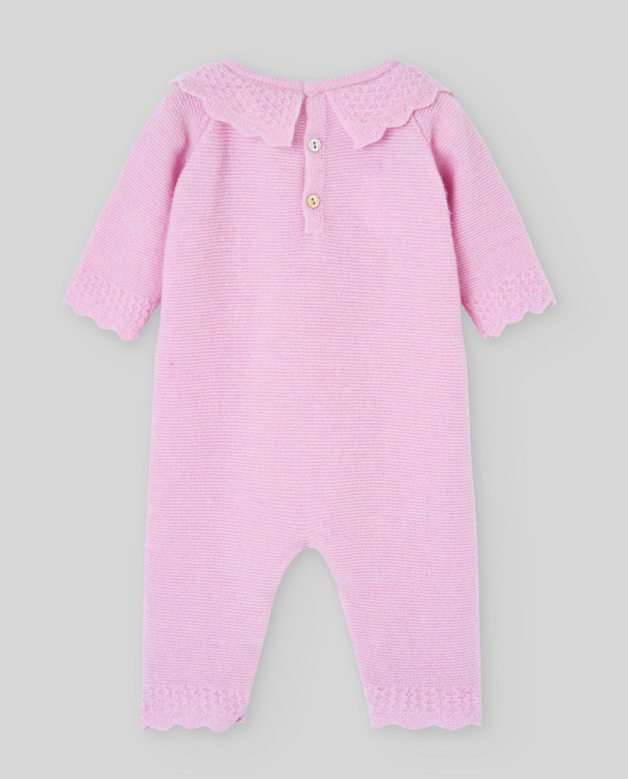 Salopeta lunga pentru fetite, tricotata simplu din lana. Design delicat, cu guler decorativ si margini ondulate, ideala pentru primele purtari si confort maxim.