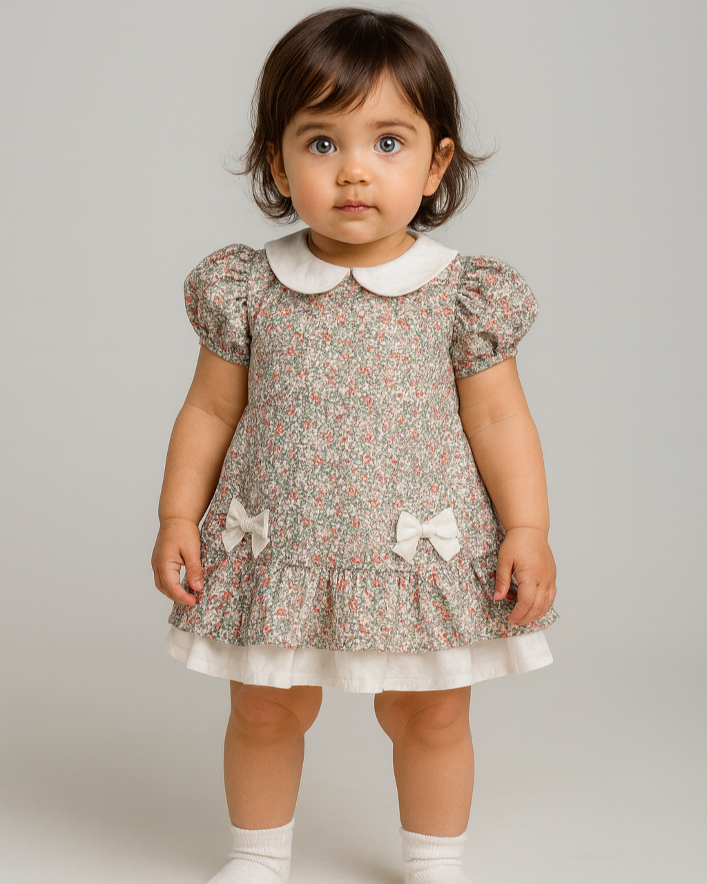 Aceasta rochiță e ca o îmbrățișare caldă într-o zi cu soare! Croită în formă de A, din bumbac moale și respirabil, cu un print floral care pare cules direct dintr-o grădină fermecată. Are mânecuțe scurte și bufante, un guler rotund alb ca frișca și două fundițe simpatice care adaugă acel „aww” instant.