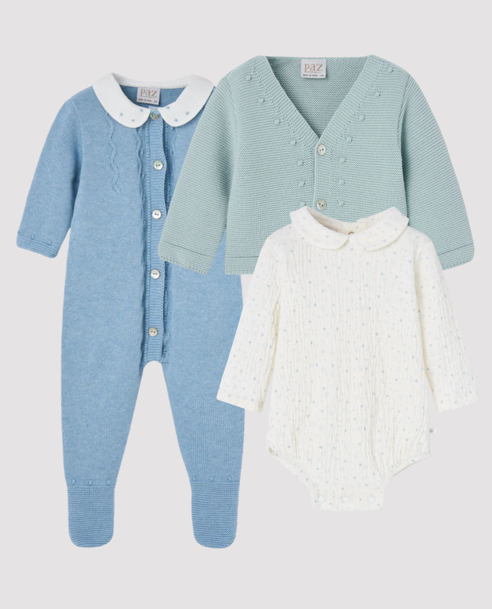 Piesele sunt realizate din materiale naturale și moi, perfecte pentru primele luni și ținute elegante de iarnă.