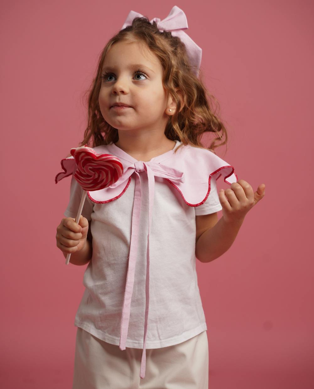 Guler detașabil realizat din bumbac 100%, în nuanță roz, cu terminație roșie delicată. Designul în formă de floare adaugă un accent feminin și rafinat, ideal pentru a completa orice ținută cu un detaliu special.