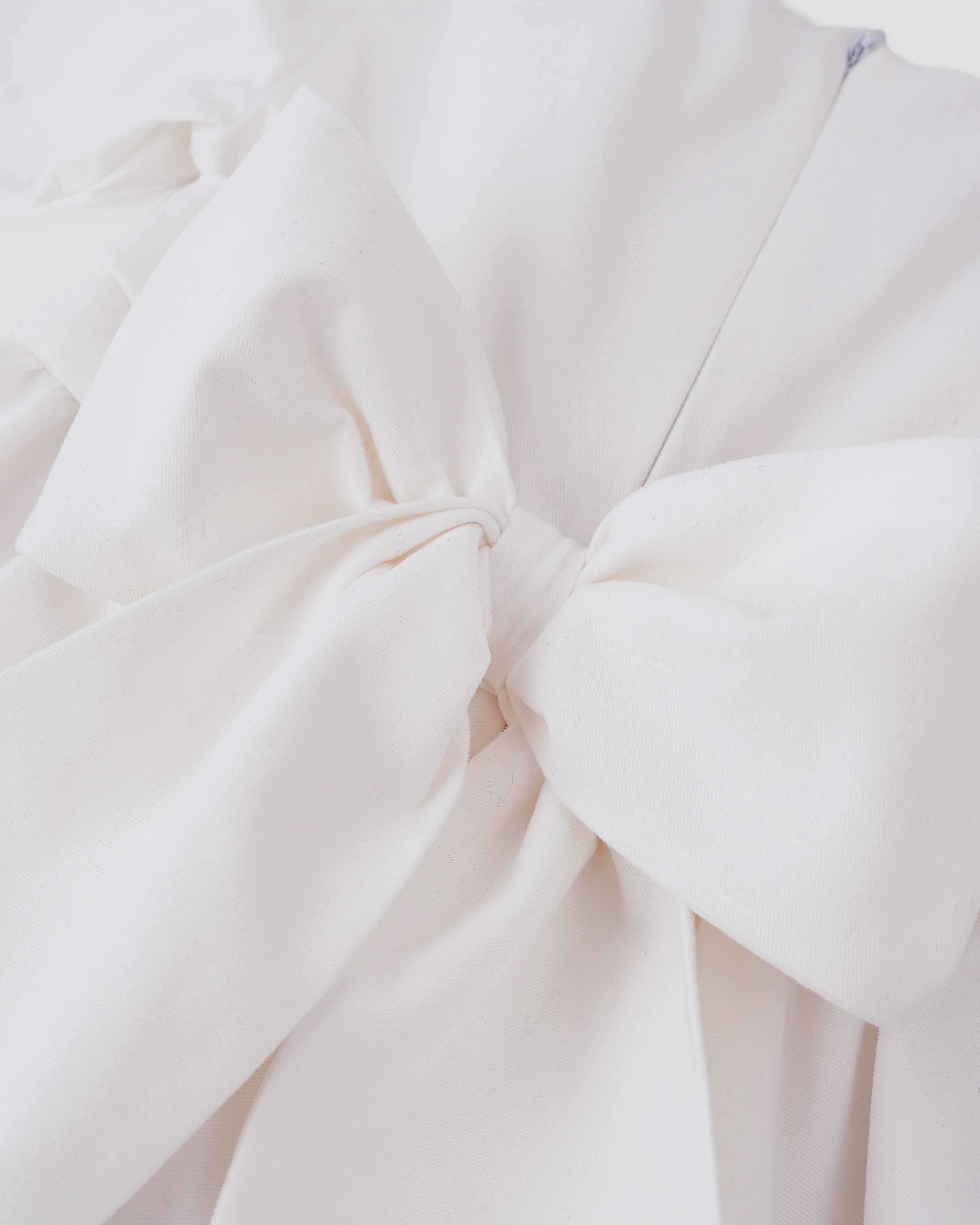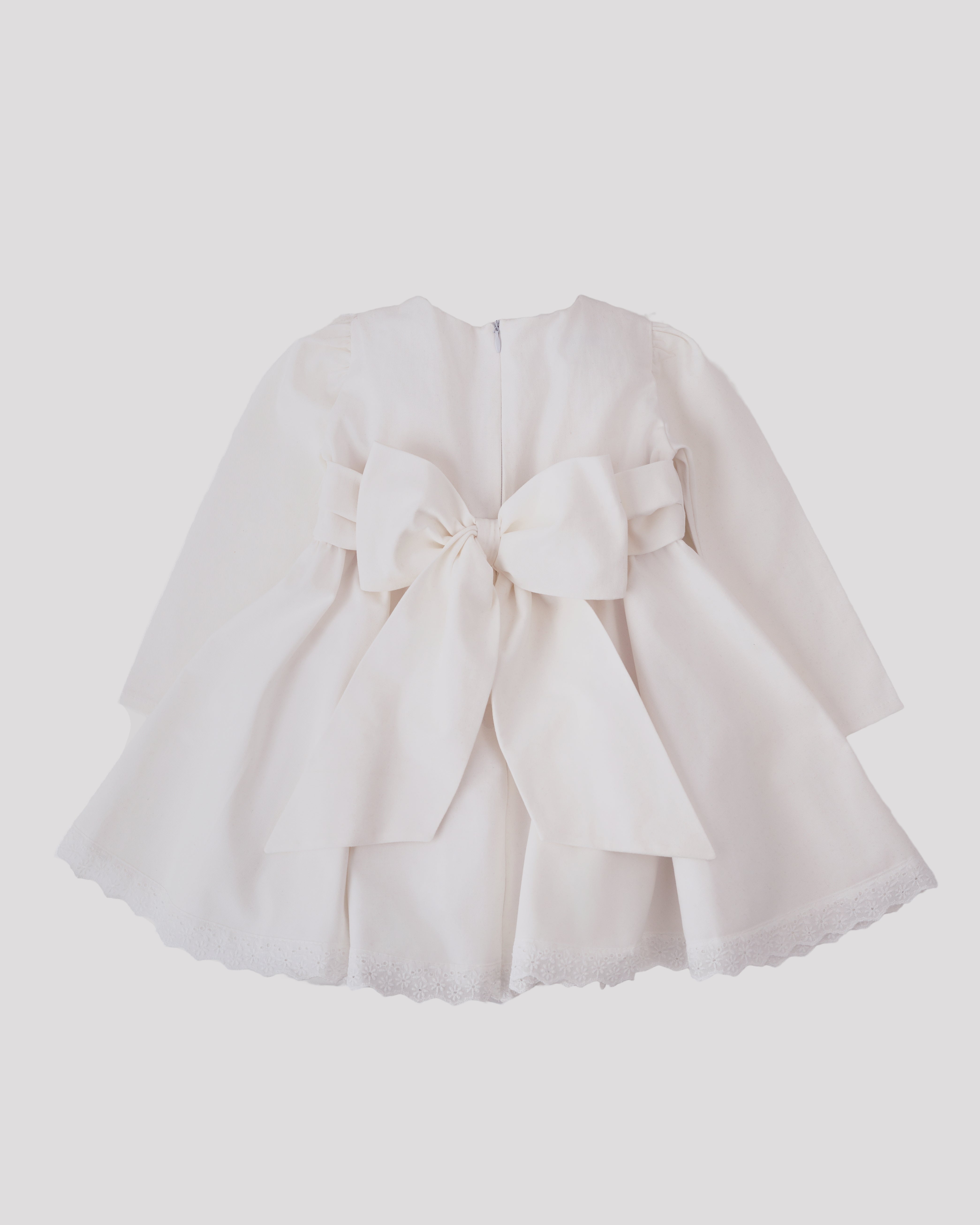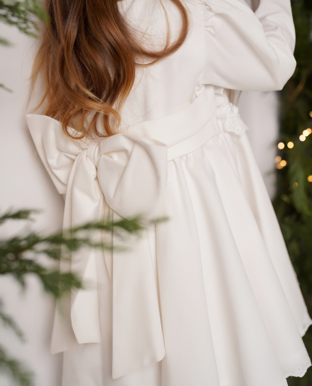 Rochia impresionează prin detalii fine: dantelă brodată, volănașe elegante, perluțe aplicate manual și o fundă maxi spectaculoasă la spate, care oferă un efect superb în poze. Materialul este moale, plăcut la atingere și potrivit pentru pielea sensibilă a celor mici. Croiala amplă permite libertate totală de mișcare.
