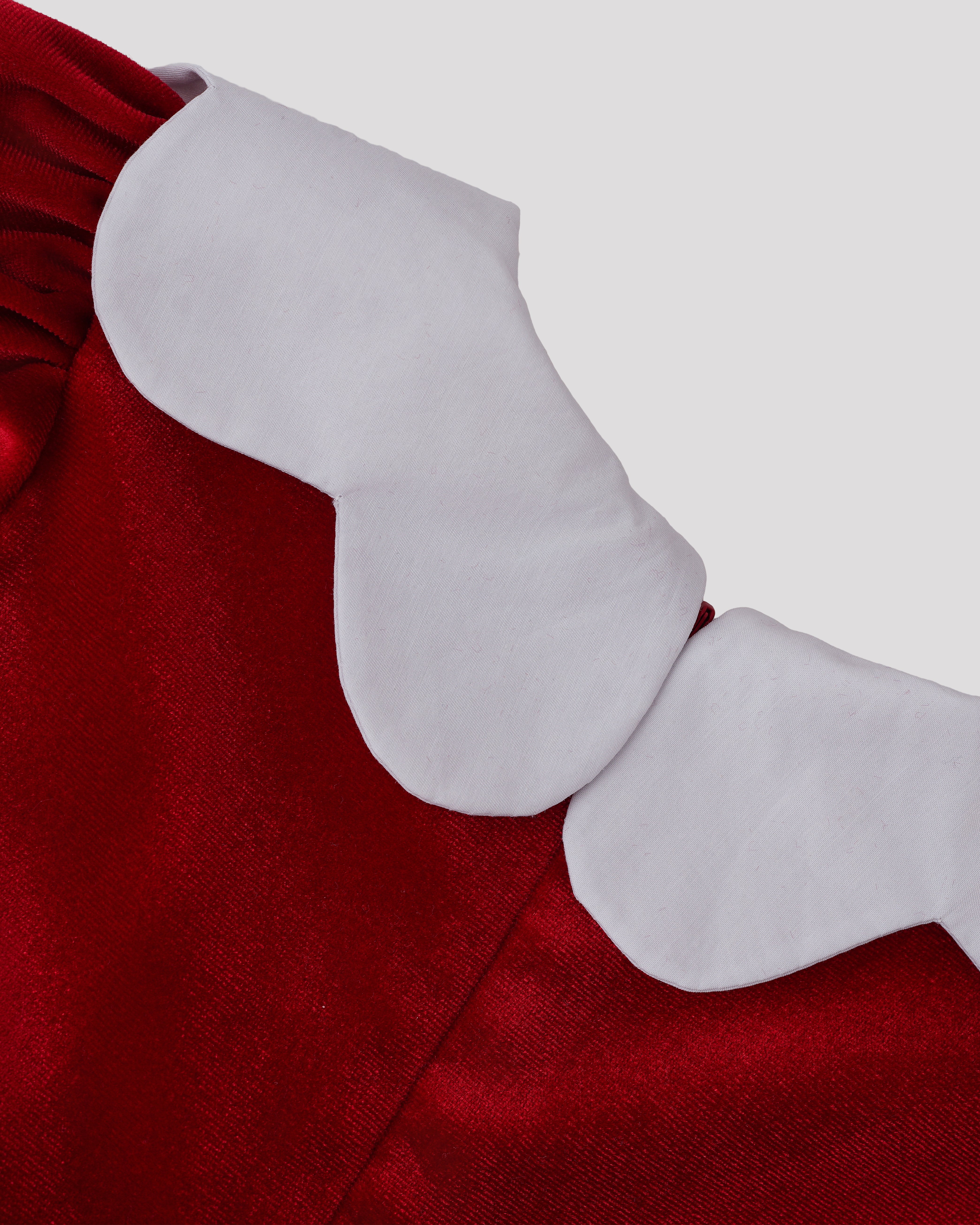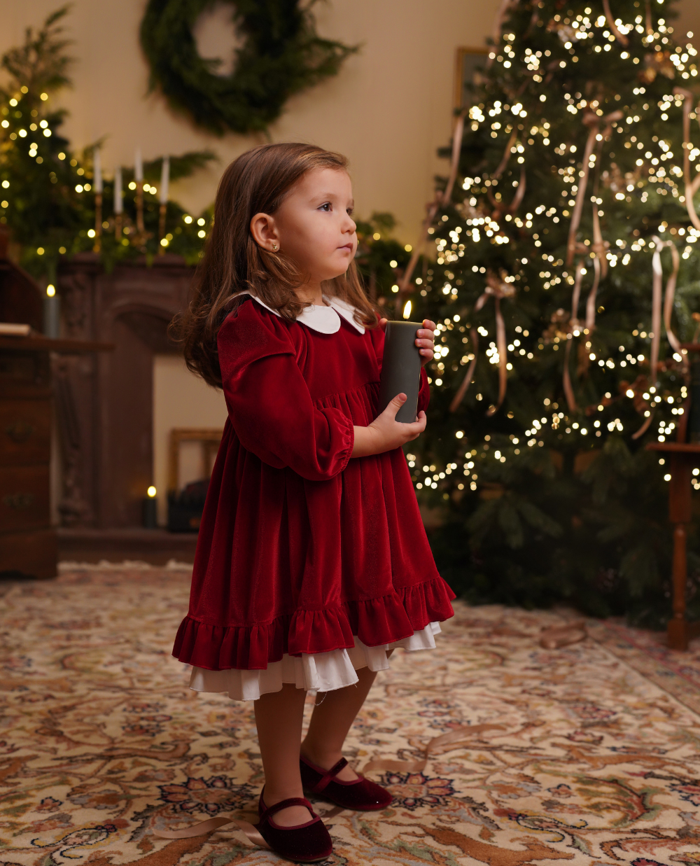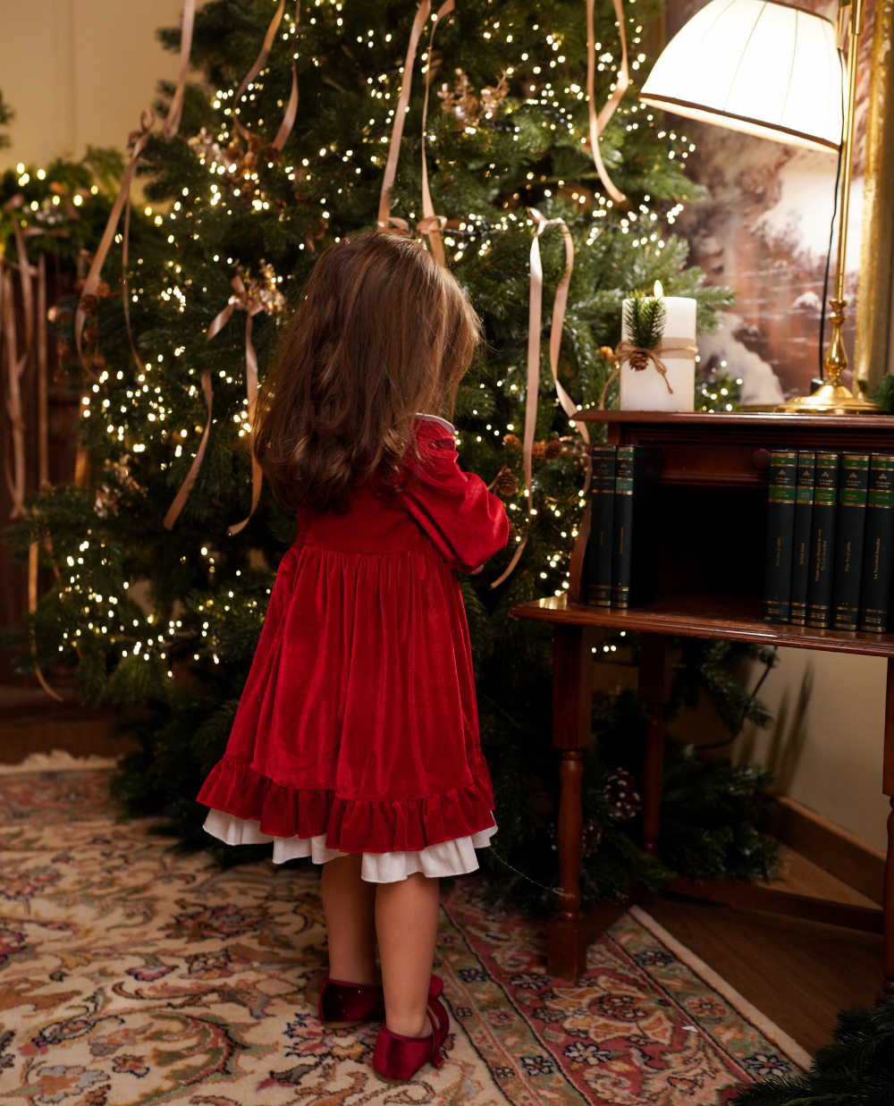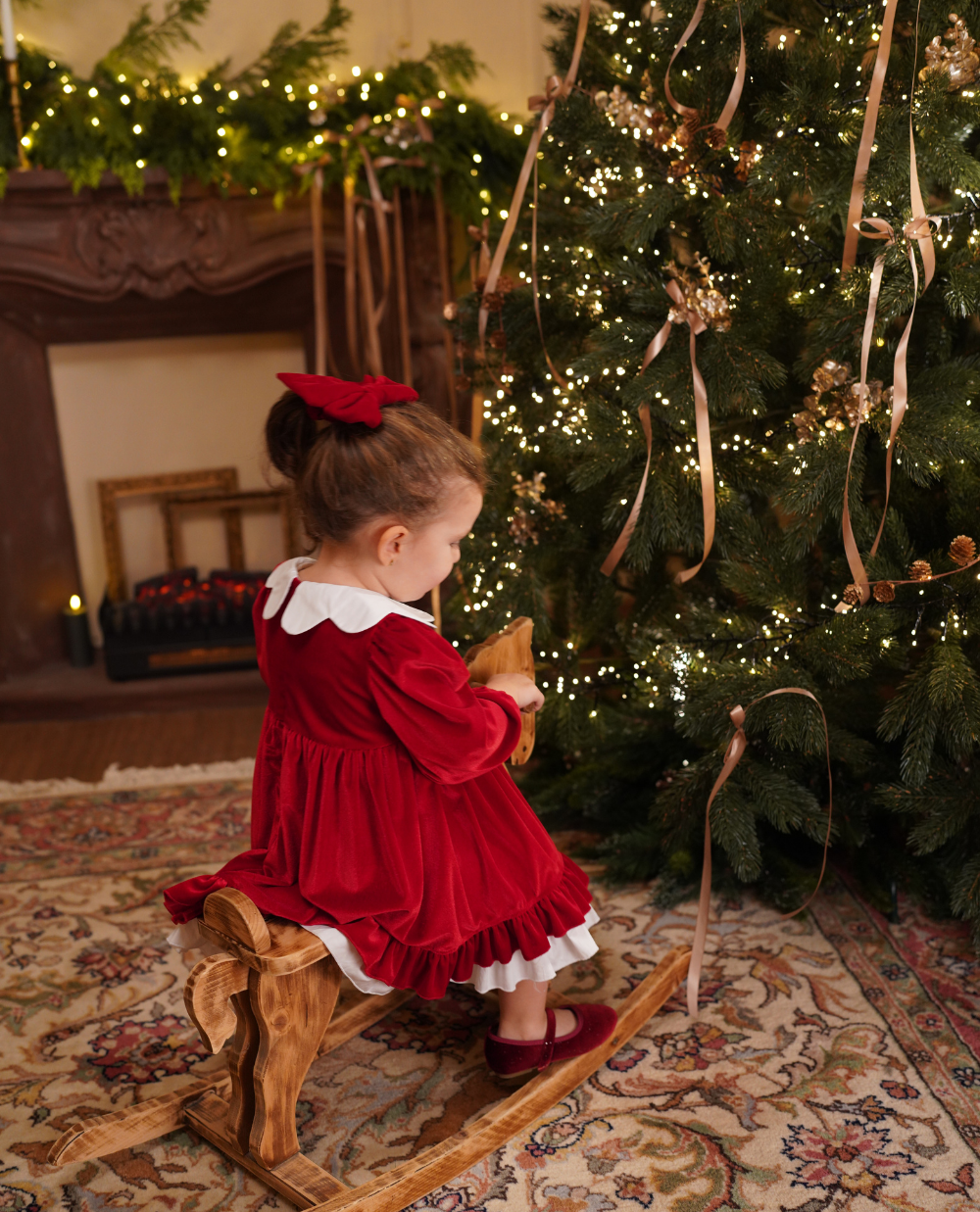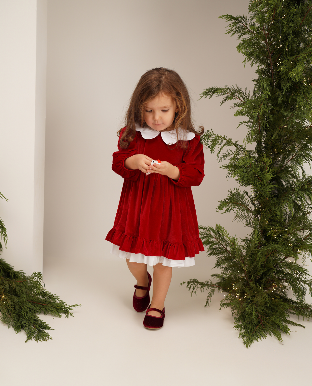 O rochiță absolut fermecătoare, perfectă pentru sezonul sărbătorilor! Confecționată din catifea, bumbac 100% si captusita in interior, rochița are o croială amplă și lejeră, cu falduri delicate ce oferă un aspect elegant și clasic.