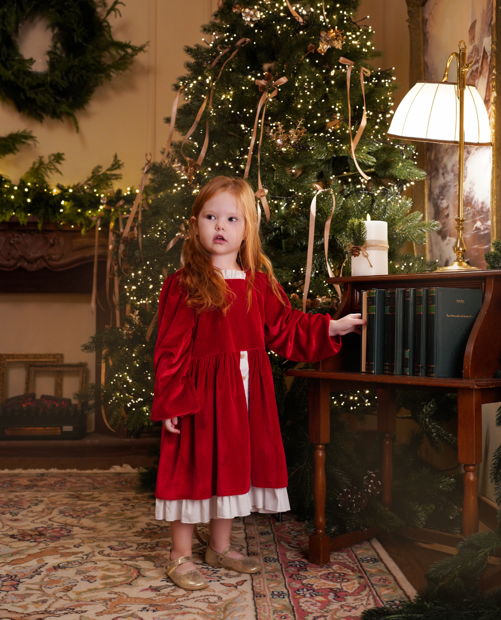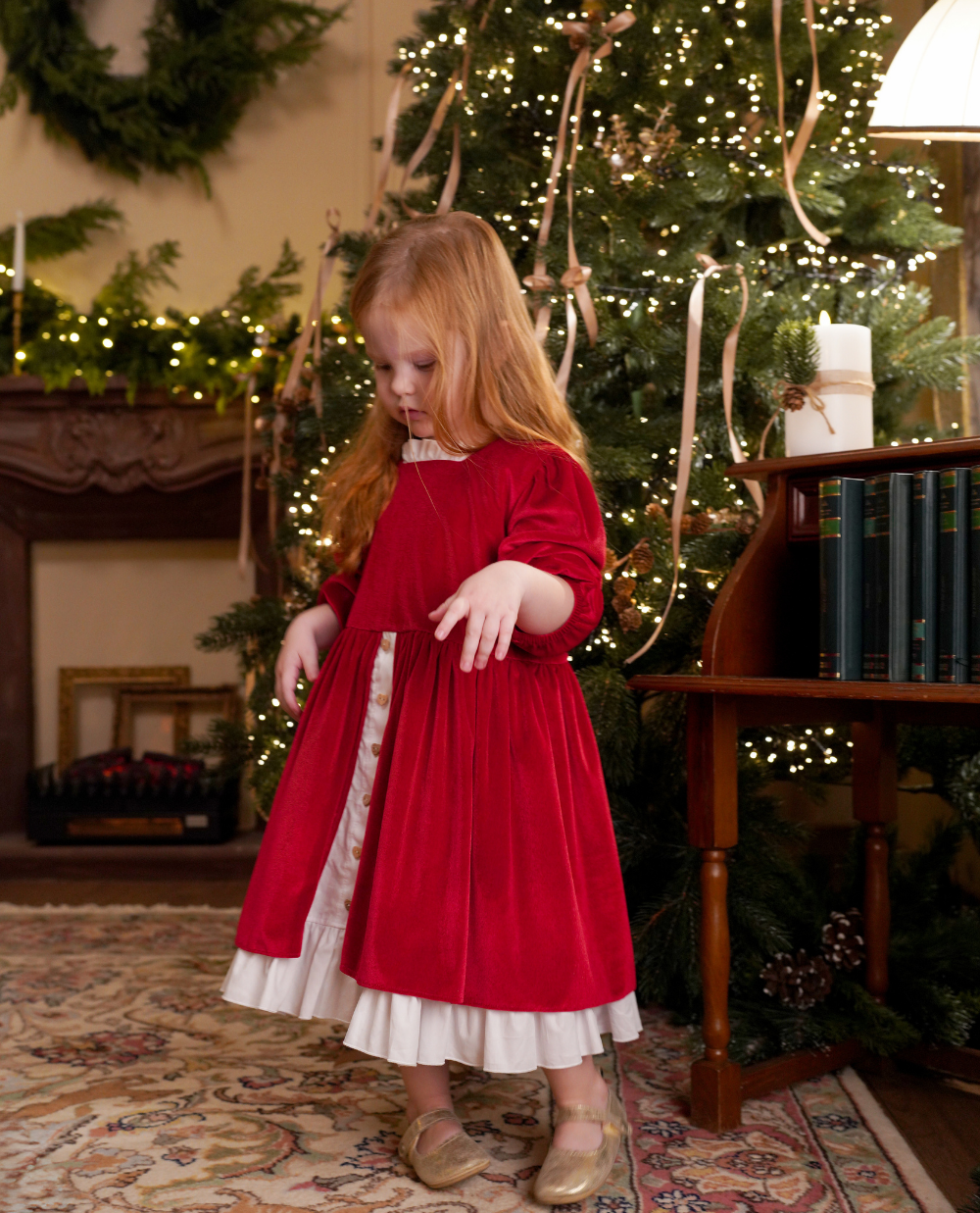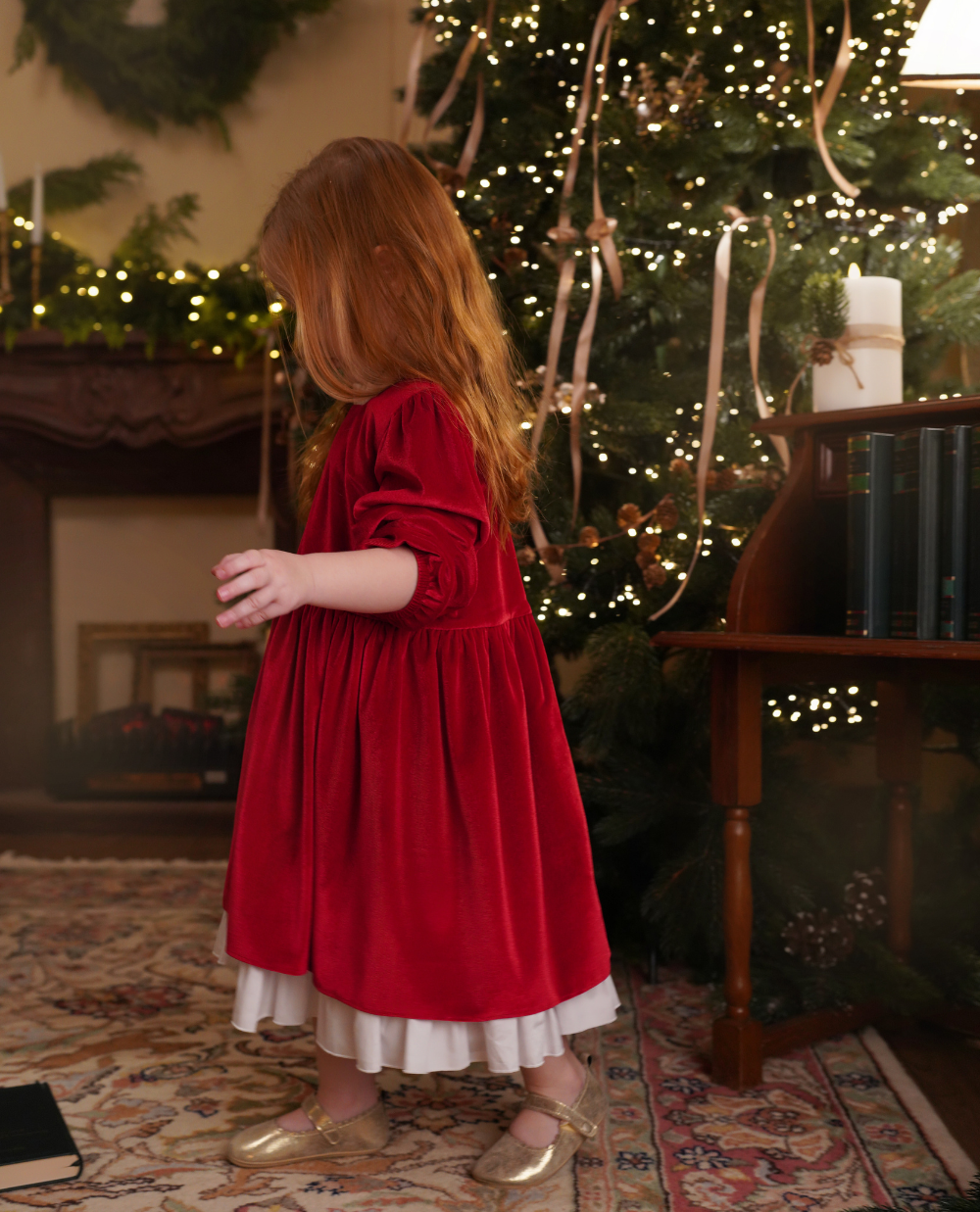 Această rochiță din catifea rosie este adorabila! ideală pentru sărbători și evenimente festive. Realizată dintr-un material moale și plăcut la atingere, rochița are o croială amplă și confortabilă, cu pliuri delicate ce îi oferă un aer vintage.